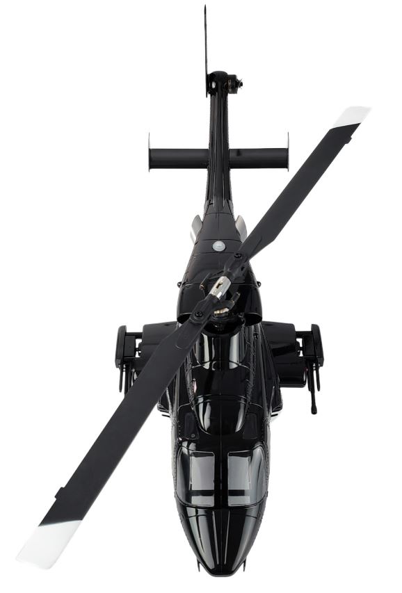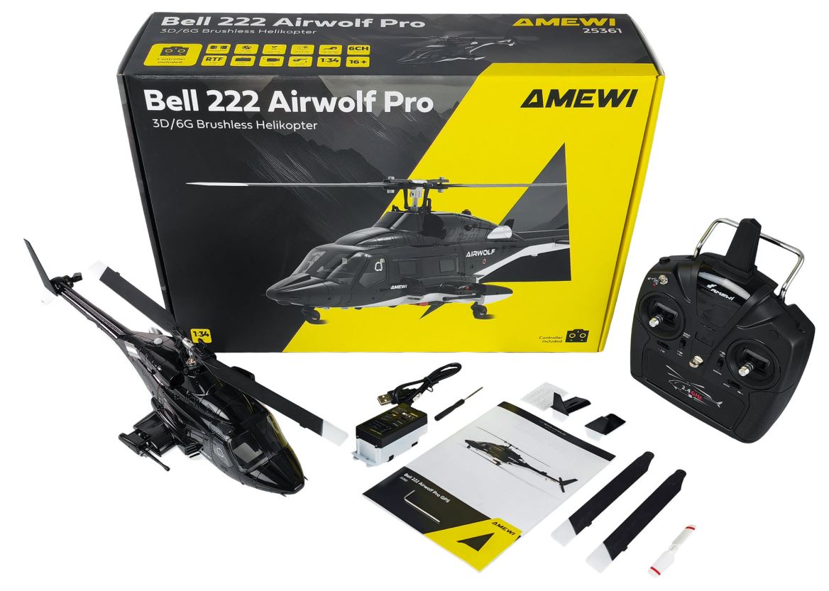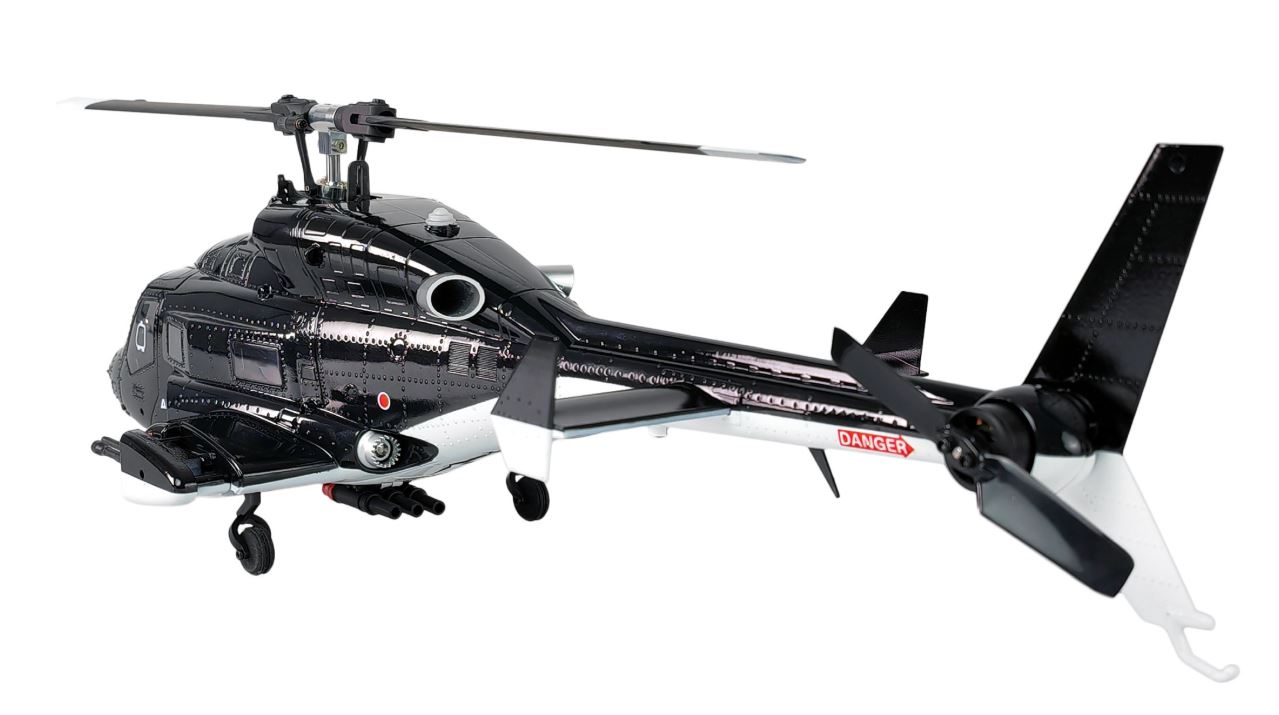 Das hier vorgestellte Modell ist ein Scale-Nachbau des Airwolf-Helikopters mit zahlreichen Details, die dem Original nachempfunden sind: Die schwarz-weiße Lackierung, Nachbildungen der Bordbewaffnung sowie integrierte LED-Beleuchtung unterstreichen das charakteristische Erscheinungsbild. Die Rumpfzelle besteht aus robustem ABS-Kunststoff. Rotorkopf und Teile der Taumelscheibe sind aus Aluminium gefertigt. Der Antrieb erfolgt über Brushless-Motoren mit 1200KV am Hauptrotor und 5500KV am Heckrotor. In Kombination mit dem mitgelieferten 7,4V 1200mAh LiPo-Akku ergibt sich eine leistungsstarke Einheit für dynamische Flugmanöver.