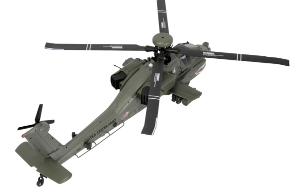 Für die Steuerung ist der Apache AH-64D mit einem innovativen Stabilisierungssystem ausgestattet, das sowohl optische als auch barometrische Sensoren nutzt. Diese Technik ermöglicht automatische Höhenkontrolle, Autostabilisierung, eine Haltefunktion sowie ein sicheres Auto-Landing. Damit eignet sich das Modell sowohl für Einsteiger, die von den zahlreichen Sicherheitsfunktionen profitieren, als auch für erfahrene Piloten, die die hohe Präzision und das stabile Flugverhalten schätzen. Ergänzend können über die Fernsteuerung verschiedene Flugmodi gewählt werden: vom manuellen Betrieb über einen Einsteiger- und Profimodus mit Dual Rate bis hin zu anspruchsvollen 3D-Manövern wie Rückenflug auf Knopfdruck. Die Steuerung ist zudem flexibel zwischen Mode 1 und Mode 2 umschaltbar, sodass unterschiedliche Vorlieben berücksichtigt werden.