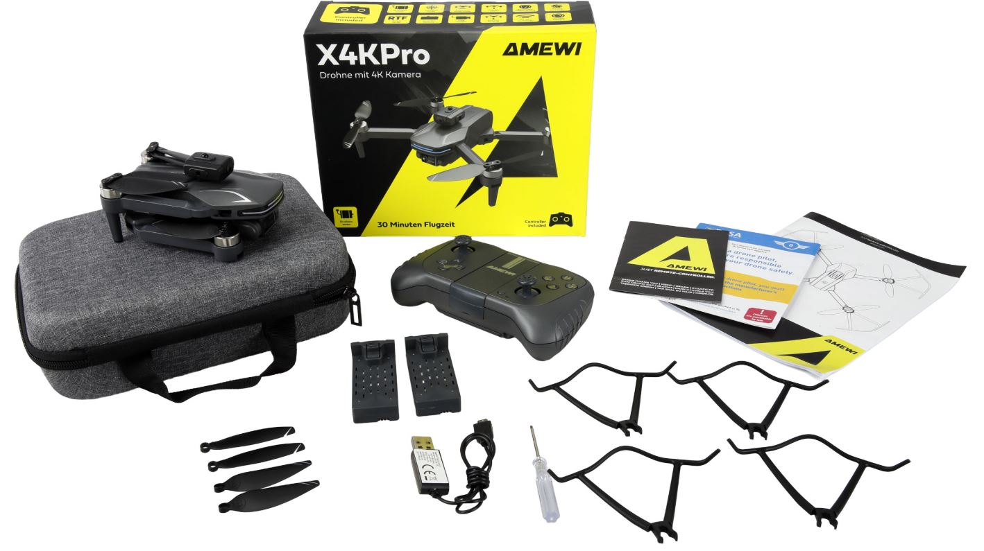 Mit einer Flugzeit von bis zu 30 (2x15) Minuten – ermöglicht durch die beiden mitgelieferten Akkus – steht ausgedehnten Flugabenteuern nichts im Weg: Die Drohne wird im Ready-to-Fly-Set geliefert, inklusive Fernsteuerung, Ladekabel und praktischer Transporttasche. Durch das faltbare Design ist sie leicht zu transportieren, das geringe Abfluggewicht von nur 149 Gramm macht sie besonders handlich. Die Steuerung kann wahlweise über die Fernbedienung oder eine Smartphone-App erfolgen. Drei wählbare Geschwindigkeitsstufen, ein Headless-Modus für eine vereinfachte Orientierung, ein 3D-Flip-Modus sowie eine stabile 6-Achs-Gyroskop-Steuerung bieten vielfältige Flugoptionen. Zusätzliche Sicherheit bieten optische Sensoren zur Höhenhaltung, ein Unterspannungsalarm bei schwächer werdendem Akku und ein störungssicheres 2,4-GHz-Steuersystem. Die X4KPro ist damit eine vielseitige Drohne, die sowohl für Einsteiger als auch für fortgeschrittene Nutzer geeignet ist.