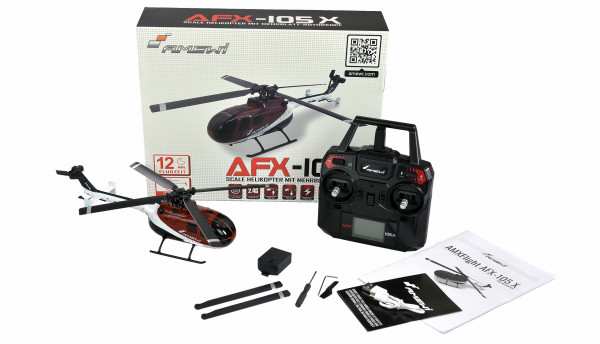 Die AFX-105 X ist ein originalgetreuer Nachbau eines der weltweit bekanntesten Hubschrauber, der Bölkow Bo 105, mit einer auffälligen Spezial-Lackierung. Der gesamte Aufbau des Modells ist robust gefertigt. Der neu konstruierte 4-Blatt-Rotorkopf wird von einem präzisen Stabilisationssystem unterstützt und verleiht dem Heli dank Auto-Start und Auto-Landing ein völlig neues Steuergefühl. Durch die neuartige Elektronik ist es nun auch Einsteigern möglich, einen solchen Mehrblatt-Helikopter ohne größere Vorkenntnisse zu fliegen.