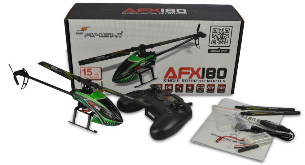 „Einfach“ Hubschrauber fliegen – diese Aussage gilt bei diesem Flybarless-Modell ganz besonders. Mit einem Rotordurchmesser von 320mm wird der AFX180 Single-Rotor von einem 3D / 6G Gyro gesteuert und verfügt zudem über einen automatischen "Höhe halten"-Modus (Att. Hold). Obendrein ist bei diesem tollen Einsteiger-Heli eine Autostartfunktion verbaut, die das Modell auf Knopfdruck abheben und in sicherer Höhe eigenständig schweben lässt. Der Pilot kann sich somit entspannt auf die wesentlichen Steuerfunktion konzentrieren – und braucht sich um das Gas und das Heck nicht mehr zu kümmern. Während das 6G-System also hinten sauber ausbalanciert, müssen selbst nur noch die Funktionen Nick (vor/zurück) und Roll (rechts/links) gesteuert werden. Im 6G-Modus ist zudem der maximale Ausschlag der Servos begrenzt, wodurch das System ähnlich einem Koaxial Hubschrauber agiert. Wenn der Knüppel am Sender in der Mittelstellung ist, stabilisiert sich das Modell automatisch wieder um die Neutralachse. Für schnellere Flüge oder bei leichtem Wind steht noch eine Dual Rate Funktion zur Verfügung, die mehr Servoweg frei gibt. Dadurch wird das Modell agiler und flotter. Insgesamt aus robustem Material hergestellt und mit einem großen LiPo Akku 2S 7,4V, 700mAh ausgestattet, sind lange Flugzeiten von bis zu 15 Minuten möglich. Innerhalb von 70-90 Minuten per USB-Kabel schnell wieder aufgeladen, kann mit dem AFX180 Single-Rotor Helikopter erneut abgehoben und die Höhenluft in vollen Zügen genossen werden.