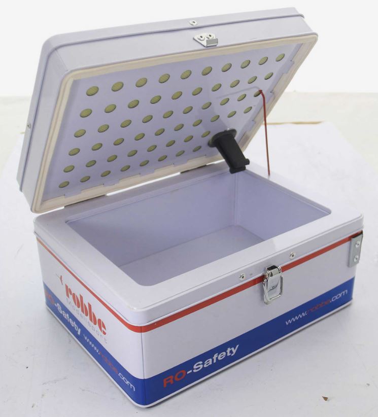 Der ro-safety ist so konstruiert das die Akkus darin geladen und natürlich gelagert werden können. Die Ladekabel werden durch eine flammsichere Öffnung nach außen geführt. Im Falle eines Brandes der Akkus, kann der entstehende Druck im Inneren nach außen austreten. Dies geschieht durch die oberen Lüftungsbohrungen, gleichzeitig wird der Rauch abgekühlt. Im Inneren der Box können bis zu 800° bei einem Brand entstehen.