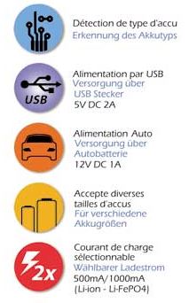 • Wählbarer Ladestrom / 500mA / 1000mA (Für Li-ion et Li-FePO4)