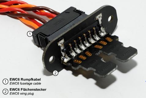 Den EWC6-Flächenstecker verschrauben Sie in der Wurzelrippe der Tragfläche Ihres Flugmodells. Auf den sechs Pins der Platine des EWC6-Flächensteckers verlöten Sie die Anschlusskabel der Flächenservos.