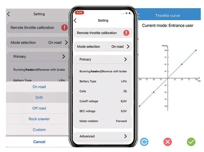 0,1V-Schrittanpassung, Kurvenanpassung von Brems- und Beschleunigungsparametern, die es dem Benutzer ermöglichen, handlicher und manipulativer zu sein und die Vorwärtsleistung und Bremskraft des Motors genau einzustellen, speziell für RC Crawler, die Eigenschaften, die auf dem härtesten Terrain arbeiten.