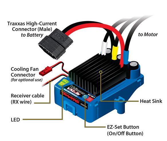 - Das EZ-Set® Druckknopf-Setup funktioniert und programmiert wie andere Traxxas Geschwindigkeitsregler, wie z.B. der XL-5. Dadurch entfällt die Notwendigkeit, einen neuen Satz von Prozeduren zu erlernen.
