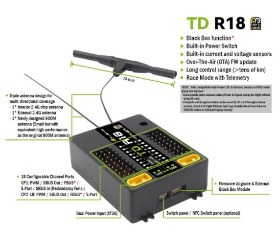 Die Flugdaten (Strom- und Signaldaten) bei Störungen während des Fluges können von den Tandem-Empfängern über ein eingebautes Blackbox-Modul aufgezeichnet werden, zusätzlich kann der TD-R18 die kompletten Flugdaten ( Steuerung, Fluglage, etc.) über eine SD-Karte speichern, welche über das externe Black-Box-Modul (optional) angeschlossen wird. Der TD-R18 verfügt außerdem über eine Buchse, an die der NFC-Power-Switch Panel angeschlossen werden kann, um die eingebaute Power-Switch-Funktion zu aktivieren.