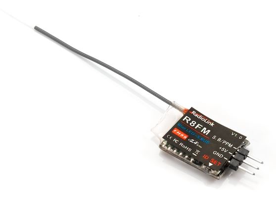 Radiolink R8FM 2,4GHz ist ein Miniatur-8-Kanal Empfängermit Frequenzhopping. Er ist kompatibel mit den Sendern Radiolink T8FB. R8FM bietet einen umschaltbarer Serien-Signalausgang S-BUS oder PPM (8 Kanäle).