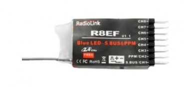 Radiolink R8EF 2,4GHz ist ein 8-Kanal Empfänger FHSS mit Frequenzhopping. Er ist kompatibel mit den Sendern Radiolink T8FB. Er bietet zwei Betriebsmodi – mit standardbreitenmodulierten (PWM)Signal-Servo-Ausgängen (8Kanäle) oder mit Serien-Ausgängen S-BUS+PPM (8 Kanäle).