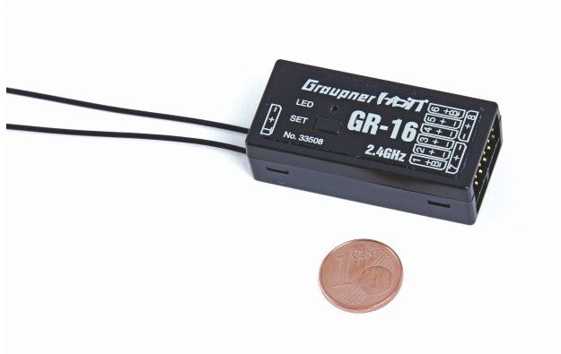 Der Graupner GR-16 Empfänger steuert bis zu 8 Servos an. Trotz des minimalen Gewichts von 12 g verfügt der Empfänger über eine integrierte Antennendiversität (antenna diversity). Diese wählt zum Empfang immer auf das beste Antennensignal. Somit ist sichergestellt, dass die Rückkanal-Daten über die besser positionierte Antenne gesendet werden.