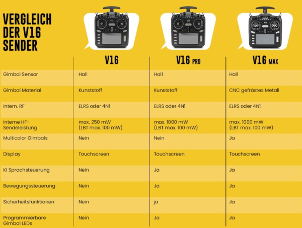 ELRS Funksystem Die V16 MAX wird mit einem internen ELRS HF-Modul angeboten. ExpressLRS (ELRS) ist ein Open-Source-Funksystem, dass eine hohe Aktualisierungsrate und geringe Latenz bieten. Es ist ideal für alle RC-Anwendungen, bei denen schnelle Reaktionszeiten entscheidend sind.