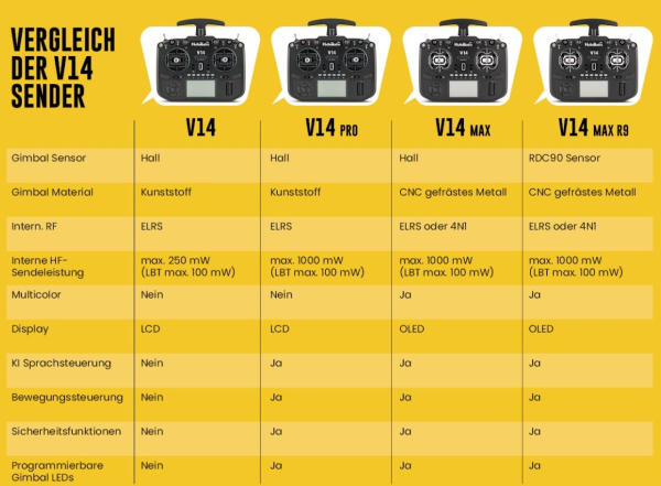 4N1 Funksystem Die V14 MAX wird mit einem internen 4N1 HF-Modul angeboten. Das 4N1 Multiprotokoll Funksystem beinhaltet die HF-Chips NRF24L01, CC2500, A7105 und CYRF6936. Es ist kompatibel mit HoTT, Futaba SFHSS, FrSky, DSM/DSMX, Walkera Devo, FlySky, AFHDS2A, Hubsan, HiSky, Syma und ASSAN Protokollen. Die 4N1 LBT-Version (Europa) ist beschränkt auf LBT-konforme Protokolle HoTT, FrSKY X/X2 LBT, und DSMX.