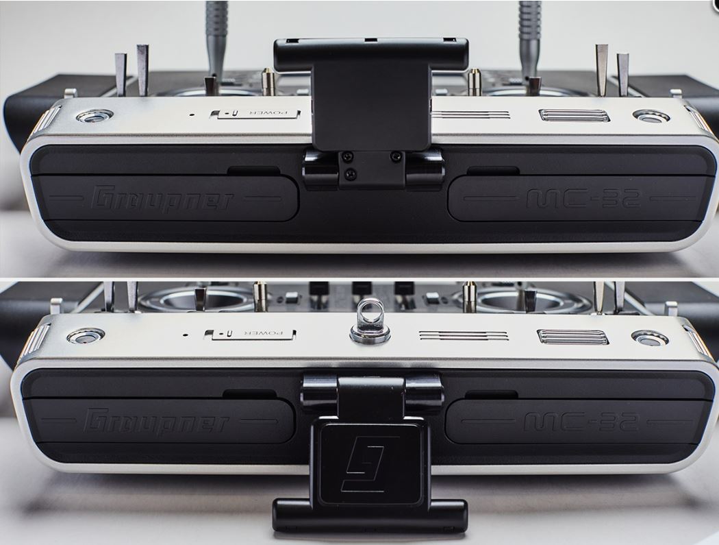 ERWEITERE DEINEN HORIZONT MIT DEM SMARTPHONE Du brauchst mehr Daten im Blick? Vieles in unserem Alltag läuft über das Smartphone. Wir bieten Dir die Möglichkeit Dein Smartphone in Dein RC-Erlebnis zu integrieren. Am oberen Rand des Aluminium-Rahmens befindet sich eine Metallhalterung, an der ein optional erhältlicher Smartphone-Halter befestigt werden kann. Ist Dein Smartphone sicher eingesetzt und per Bluetooth oder USB-Kabel verbunden, kannst Du während der RC-Action wichtige Daten über die Graupner-HoTT-Viewer-App ablesen. Das Smartphone ist so am Sender positioniert, dass Deine Augen nicht mehr so weit von Deinem Modell abweichen müssen. Durch den steilen Blickwinkel auf das Handy ist das Display auch bei direkter Sonneneinstrahlung noch ideal abzulesen. Die optionale Handy-Halterung löst das altbekannte Mini-Display am oberen Rand unserer alten Pultsender-Generationen ab. In der Praxis und zahlreichen Tests mit Modellbauern hat sich herausgestellt, dass dieses kleine Display keinen großen Mehrwert geboten hat. Mit Deinem Smartphone erhältst Du ein größeres, besser ablesbares und funktionaleres Display dazu.