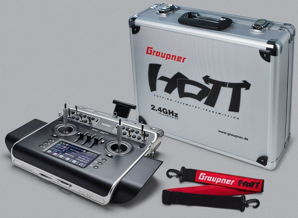 Lieferumfang • mc-32 HoTT Sender • 9000mAh LiHV-Senderakku • USB-Typ-C-Ladekabel • USB-Adapter für Empfänger- und Sensor-Updates • Senderriemen • Alukoffer