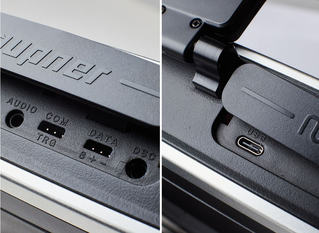 Merkmale der Hardware • 4-fach kugelgelagerte Aluminium Knüppelaggregate mit Hallsensoren und einer Auflösung von (12-Bit) 2400 Stufen bzw. 0,5us Servopuls für präzise Steuerung • Einstellbarer Modus und einstellbare Federkräfte der Knüppel durch einfaches öffnen der Rückwand, ohne Schrauben. • Sonnenablesbares 4,3 Zoll Farb-TFT-Touchdisplay • 2 redundante 2,4 GHz HF-Module • Eine zirkular polarisierte Patchantenne und eine quer eingebaute Antenne mit einstellbarem Abstrahlwinkel • 9000mAh 1S3P LiHV-Akku für Senderbetriebszeiten von ca. 10h • USB Typ C-Anschluss mit Ladefunktion, PC-Schnittstelle (für z.B. Updates, Flugsimulatoren, usw.), USB-Joystickfunktion, Massenspeicherfunktion • Kopfhörerbuchse • WLAN-fähig: für Firmware Updates • Bluetooth-fähig (z.B. für Bluetooth-Kopfhörer oder Android™ HoTT Viewer Smartphone App) • Drahtlose Lehrer- Schülerfunktion, sowie DSC-Buchse für Lehrer- Schülerbetrieb • Benutzerdefinierbare Data-Buchse für externe Module z. B. Crossfire oder ELRS-Modul • Interne 16 GB SD-Karte • mp3 und wav-Player • Lautsprecher für Sprachnachrichten und Telemetrieansagen • Benutzerdefinierbares haptisches Feedback (Vibrationsalarm) • 4 x 3-Wege Schalter, 2 x 3-Wege Schalter/Taster, 2 x 2-Wege Schalter, 4 x Proportional Drehgeber, 2 x seitliche Drehgeber, 3 Schieberegler, 8 benutzerdefinierbare digitale Tasten, 6 Navigationstasten • Smartphone-Halterung optional erhältlich