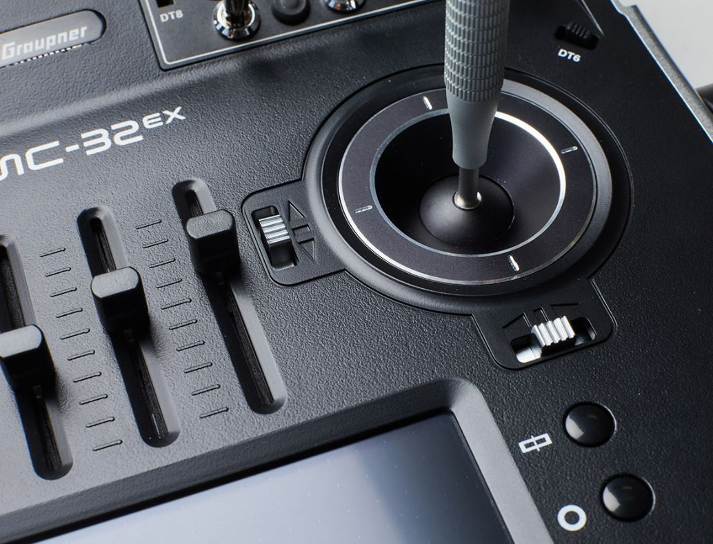 PERFEKT ABGESTIMMTE HARDWARE Die vierfach kugelgelagerten Knüppelaggregate und mit einer Auflösung der Hall Sensoren von 2400 Schritten (das entspricht einer 0,5us Servopulsänderung), sorgen für ein pures Gefühl der Kontrolle über Dein Modell. Die integrierten 3-Stufen-Schalter bieten dabei eine bequeme Schaltung von Phasen (Ebenen), Motor, Autotrim oder andere benutzerdefinierbaren Funktionen. Die Aggregate halten dabei auch schlechten Wetterverhältnissen stand und sind einfach und komfortabel von der Rückseite des Senders zugänglich, um diese auf Deine Vorlieben einzustellen. Der Sender lässt sich auch mit 4D-Knüppeln ausstatten. Einer der beiden 4D-Geber wird dann allerdings anstelle des oberen walzenförmigen Drehgebers im Sender angeschlossen, der stattdessen an einem beliebigen anderen freien Steckplatz angeschlossen werden kann.