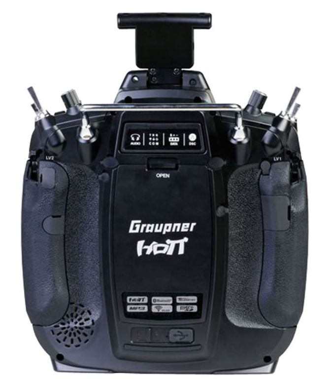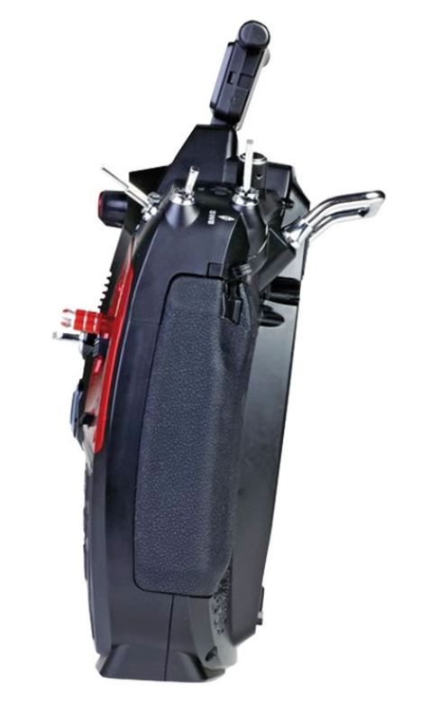 Merkmale der Hardware • 4-fach kugelgelagerte Aluminium Knüppelaggregate mit Hallsensoren und einer Auflösung von 4096 Stufen (12-Bit) für präzise Steuerung • Sonnenablesbares 4,3 Zoll Farb-TFT-Touchdisplay • 2 redundante 2,4 GHz HF-Module • Eine zirkular polarisierte Patchantenne und eine quer eingebaute Antenne mit einstellbarem Abstrahlwinkel • 9000 mAh 1S3P LiHV-Akku für Senderbetriebszeiten von 10h • Micro-USB Anschluss mit Ladefunktion, USB-Joystickfunktion, Massenspeicherfunktion, Kopfhörerbuchse • Von außen einstellbarer Modus und einstellbare Federkräfte der Knüppel • Interne 16 GB SD-Karte • WLAN- und Bluetooth-fähig • DSC-Buchse für externe Module • Kabellose Lehrer/Schüler-Funktion • Kabellose Firmware-Updates • Lautsprecher für Sprachnachrichten und Telemetrieansagen • Benutzerdefinierbare DSC und Datenports (SUMD, Crossfire und weitere) • Benutzerdefinierbares haptisches Feedback (Vibrationsalarm) • 5 x 3-Wege Schalter, 2 x 3-Wege Schalter/Taster, 1 x 2-Wege Schalter, 4 x Proportional Drehgeber, 2 x seitliche Drehgeber, 8 benutzerdefinierbare digitale Tasten, 6 Navigationstasten • Binden von beliebig vielen Empfängern zur Kanalerweiterung (max. 16 Kanäle). Der zuletzt gebundene Empfänger sendet die Telemetriedaten.