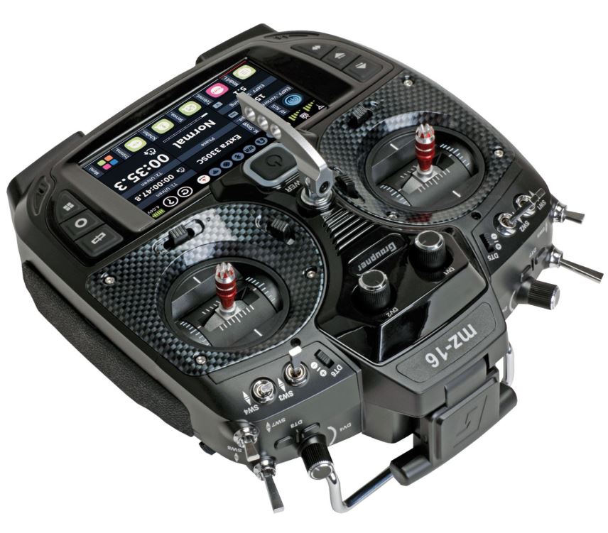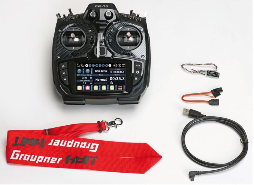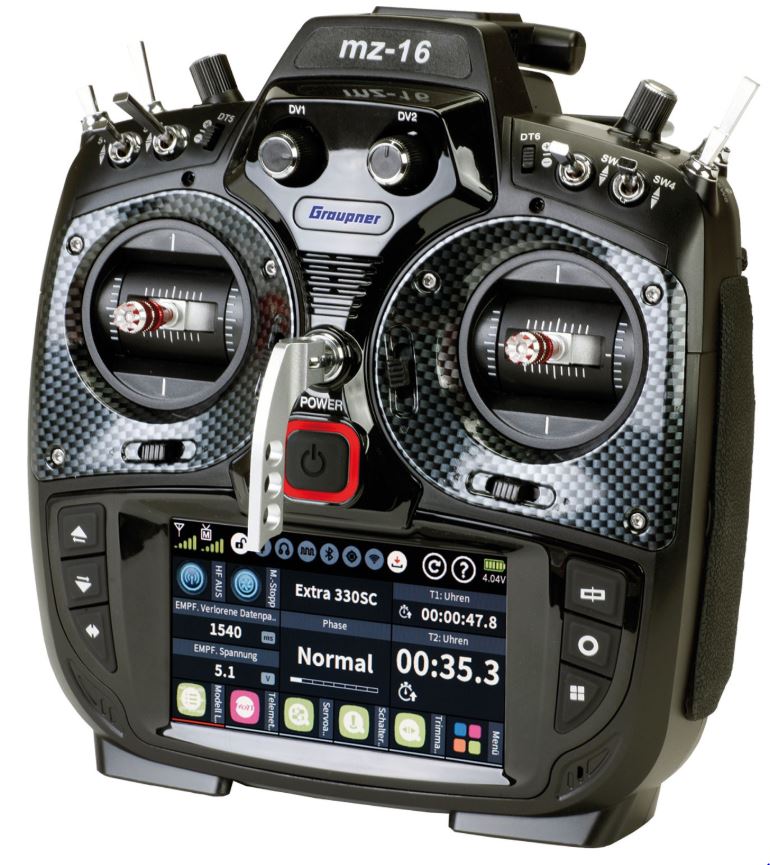 Die mz-16 bringt Dich ganz nach vorne! Es können 5 verschiedene Modelltypen gewählt werden wie Flugmodelle mit Elektro-, Verbrenner- oder Turbinenantrieb, Helikopter, Multirotor, Fahrzeuge und sogar Boote. Sie kann 999 Modelle speichern und abrufen, hat 8 Flugphasen und 12 Kurvenmischer, die global oder flugphasenabhängig programmiert werden können! Die vierfach kugelgelagerten Aluminium Knüppelaggregate sorgen für ein unbeschreibliches und nie dagewesenes Gefühl der Kontrolle über das Modell. Die Aggregate sind einfach und komfortabel von der Rückseite des Senders her zugänglich, um diese auf Deine Vorlieben einzustellen. Die mz-16 HoTT ist mit einem dualen, redundanten 2.4GHz HF System ausgerüstet. Eine eine lineare Antenne mit einstellbarem Abstrahlwinkel sorgt für eine hohe Signalqualität und erhöhte Reichweite. Die mz-16 passt sich Dir an! Der neue 4,3 Zoll TFT Touch-Farbbildschirm sorgt für einen bequemen, einfachen und schnellen Zugang zu allen Funktionen, die Du benötigst um Dein Modell einzustellen. Du hast jederzeit alles im Blick, selbst bei direkter Sonneneinstrahlung und reduzierter Bildschirmhelligkeit ist das Display perfekt zu lesen. Die hoch optimierte, grafische Benutzeroberfläche agiert so wie Dein Smartphone und schafft Dir Zugang zu allen Menüs und Funktionen. Schnell und klar, betrieben durch einen Hochleistungsprozessor. Die intuitive Bedienung durch Berühren und Wischen macht das Navigieren durch die Menüs schnell und einfach. Entwirf Deine eigenen Bildschirme, um für Dich wichtige Informationen anzuzeigen oder Menü-Schnellzugriffe zu generieren und all das mit einem einfachen Tippen auf den Bildschirm. Die mz-16 HoTT enthält über 100 Widgets mit denen Du Deine Bildschirme so zusammenstellen kannst, wie es für Dich und Deine Modelle passt. Es können sechs dieser Bildschirme kreiert werden, all dies mit nur einem Fingertipp direkt auf dem mz-16 Bildschirm, ohne PC Programmierung! Ein Sender für alle. Deutsch, Englisch, Französisch und Italienisch sind bereits integriert, weitere Sprachen folgen. Alles in einem Sender. 16 Kanäle bringen die Kontrolle für Dich! Mit 16 Kanälen bietet die mz-16 HoTT eine hohe Funktionalität und Kontrolle für jegliche Art Deiner Modelle. Du kannst bis zu vier 2.4GHz Empfänger binden und damit die Aufteilung und Verteilung der Kanäle nach Belieben vornehmen. Benötigst Du noch mehr Kanäle und die Schalter gehen aus? Die mz-16 beinhaltet zusätzliche 16 digitale Schalter, die mit einem einfachen Tippen und mit Hilfe des Widget-Menüs zugeordnet und gesteuert werden. Kreiere nahezu unendlich viele digitale Schalterkombinationen, um zum Beispiel die Beleuchtung oder Rauch zu steuern, Kräne oder Wasserwerfer zu drehen oder einfach das zu realisieren, was Dir in den Sinn kommt, ohne dass Dir die Schalter ausgehen. Die Logik-Schalter (UND, ODER, GLEICH, UNGLEICH), Geber- und Kombinationsschalter erhöhen die Vielfalt an Schalt- und Steuermöglichkeiten zudem enorm. Jeder dieser Schalter steuert in Abhängigkeit seiner Schaltposition oder der Knüppelposition die Funktionen die Du realisieren möchtest. Du legst fest, wie jeder einzelne Schalter benannt werden soll. Sprachausgabe die Dich interessiert! Hören, was Sache ist? Die mz-16 HoTT bietet nahezu viele Möglichkeiten an konfigurierbarer Sprachausgabe für das Telemetriesystem und den Senderstatus selbst. Schalterstellungen, Flugphasen, Warnungen, Variotöne, Telemetrieinformationen und vieles mehr. Die mz-16 beginnt vom Moment des Einschaltens an mit Dir zu interagieren und informiert Dich über falsche Knüppel- oder Schalterstellungen für das gewählte Modell. Keine Überraschungen durch einklappende Fahrwerke, hochlaufende Motoren oder falsche Gyro-Einstellungen. Die mz-16 informiert Dich, wenn nötig, sogar, wenn Du vergessen hast, Dein Fahrwerk auszufahren, Du drohst außer Reichweite zu kommen oder die Akkuspannung gefährlich niedrig wird. Diese Probleme gehören der Vergangenheit an! Mit über 600 installierten Sprachdateien erhältst Du eine unglaubliche Vielfalt an Kombinationsmöglichkeiten von Sprachausgaben. Wenn nötig kannst Du so viele eigene Dateien wie Du möchtest mit einem Editor 'Text zu Sprache' kreieren und diese nach Belieben verwenden. Hilfe wenn Du sie brauchst! Brauchst Du während der Programmierung oder Einstellung Hilfe? Vergiss dicke Handbücher oder die unendliche Suche im Internet! Die mz-16 HoTT bietet Dir Hilfe direkt dort, wo Du sie benötigst. Jedes Menü und jede Option hat ihren eigenen Hilfetext direkt auf dem Bildschirm verfügbar. Tippe nur auf das Fragezeichen und Du bekommst die passende Hilfe und Unterstützung angezeigt. Du möchtest andere Hilfetexte? Die Texte können ganz einfach angepasst oder auch erweitertwerden. Die mz-16 ist für Dich da und gibt Dir die Möglichkeit, das zu tun, was Du möchtest und am liebsten machst. Konnektivität die Dich weiterbringt! Integriertes Wi-Fi® verbindet die Fernsteuerung mz-16 HoTT mit dem Rest der Welt! Optional ist auch Bluetooth® verfügbar z.B. für ein Headset, um Sprachwarnungen oder einfach nur Musik zu hören ' Du hast die Wahl! Verbinde den Sender mit Deinem W-LAN Netz, um benachrichtigt zu werden, wenn neue Firmware verfügbar ist, um diese dann direkt per W-LAN auf den Sender zu laden und zu installieren. Deine mz-16 ist so immer auf dem neuesten Stand und Du verpasst nichts! Natürlich kann das Update auch herkömmlich über das beigelegte USB Kabel erfolgen und, wie bisher, die neueste Firmware auf unserer Homepage gefunden werden. Die Konnektivität geht noch weiter, die integrierte Mikro USB Schnittstelle kann für das Laden des Senders verwendet werden. Auch wird hierüber auf dieintegrierte 16 GB Mikro SD Speicherkarte zugegriffen. Gespeicherte Bildschirme, Modelle, Sprachdateien, Musik, Screenshots und weitere Daten können darauf gespeichert und verwaltet werden. Mit Hilfe der USB- sowie der DSC-Schnittstelle (zusätzlicher Dongle nötig), kan