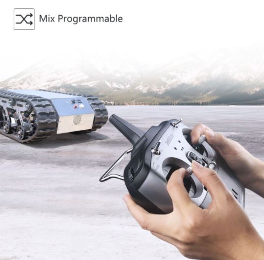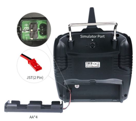 8-Kanal RC-Set 2.4GHz FHSS mit Kreuzknüppeln, 2 Schaltern, 2 Drehgebern, Reverse-Schalter für Kanal 1-4. Empfänger R8EF. Wenn er an einen PC oder Smartphone (Android) angeschlossen ist, kann er wie ein herkömmlicher Computersender programmiert werden.