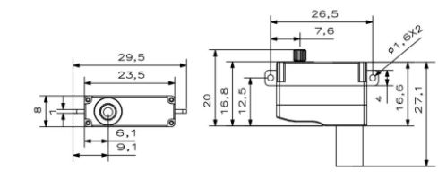 Beiliegendes Zubehör: 3 Kunststoff-Servoarme, 1 Servoarmschraube, 2 Befestigungsschrauben Die Maße beziehen sich auf das Gehäuse, ohne Berücksichtigung der Befestigungsflansche, des ggf. herausschauenden Motors und des Abtriebes. Bitte beachten Sie auch die Bemaßungen in einem der Fotos.