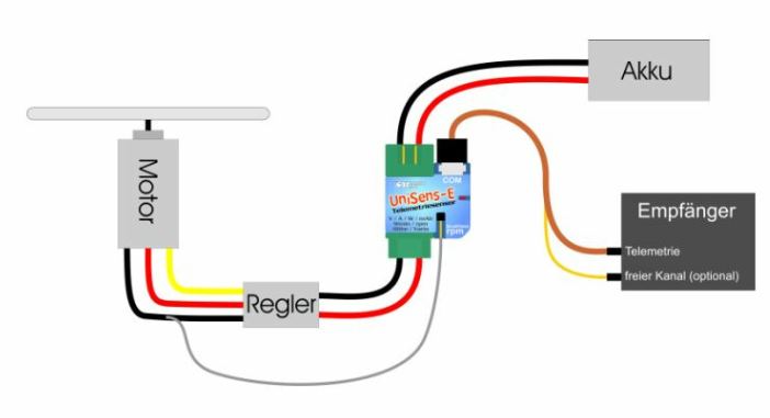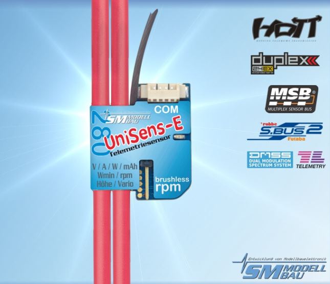 Der UniSens-E ist ein reiner Telemetriesensor speziell für alle Elektromodelle. Er ist so klein und leicht, gleichzeitig aber so leistungsfähig, dass er fast in jedem Modell eingesetzt werden kann.