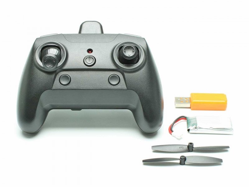 Als Akku liefern wir einen modernen LiPo Akku mit, der Flüge bis über 10 Minuten (je nach Flugstil) ermöglicht. Zum Lieferumfang gehört außerdem noch bequemer USB Ladestecker und zwei Ersatzpropeller.