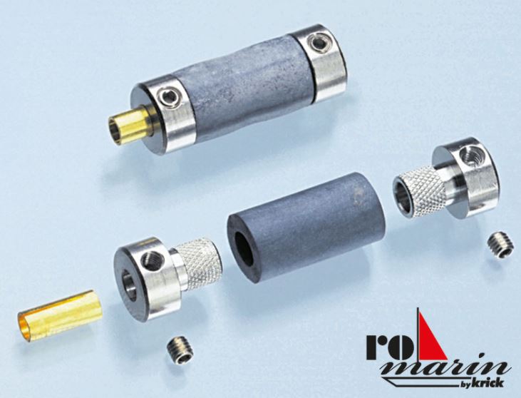 Wellenkupplung mit fexiblen Gummimittelteil für Motoren mit mittlerer Leistung. Die Metallteile der Schiffskupplung werden mittels einer Madenschraube auf der Welle fixiert. Passend für 4 mm Wellen. Der Durchmesser kann mit der beiliegenden Distanzhülse einmal auf 3,2 mm reduziert werden.
