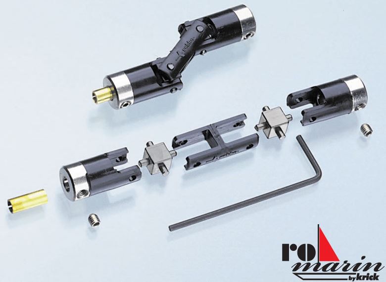 Doppel-Kreuzgelenkkupplung für Schiffsantriebe. Wellenversatz-Ausgleich ca. 2 mm. Aus hochschlagzähem, selbstschmierendem Delrin hergestellt. Die eingespritzten MS-Buchsen sind beidseitig für 4 mm-Wellen ausgelegt. Durch Einsetzen der beiliegenden Distanzhülse können auch Wellen von 3 und 3,2 mm angeschlossen werden. Die Kupplung wird auf jeder Seite mit einer Madenschraube auf der Welle fixiert. Lieferung mit Sechskantschlüssel 1,5 mm.