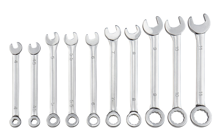 10-teiliges Ringmaulschlüssel-Set in kleinen Größen und verchromter Ausführung. Schlüsselweiten 4 / 4,5 / 5 / 5,5 / 6 / 7 / 8 / 9 / 10 / 11 mm. Jede Größe als Ring- und als Maulöffnung enthalten.