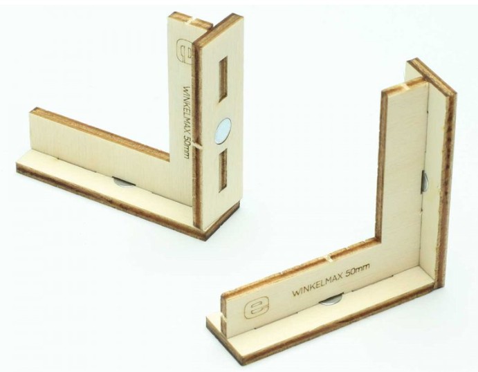 Winkelmax 50mm magnetisch 8 Stück Magnetische 90° Modellbauwinkel, ideal zum rechtwinkeligen Ausrichten von Bauteilen wie z.B. Rippen, Rümpfe, Kreuzrümpfe aus Flachschaum, usw. Packung mit 8 Stück Winkel und inkl. 20 Magnete. Technische Daten Höhe = 50mm Breite = 15mm Material = 3mm Sperrholz