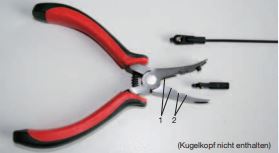 Praktischer Helfer zum Ein-, Ausdrücken und Einstellen von Kugelköpfen, ohne Kopf und Kugel zu beschädigen, passend für viele im Modellbau übliche Kugelköpfe, bei denen die Kugel oben offen liegt, zusätzlich mit gezahnter Greiffläche (1) und zwei Löchern (ø 1,2 und 3mm) zum Abwinkeln von Drähten (2)